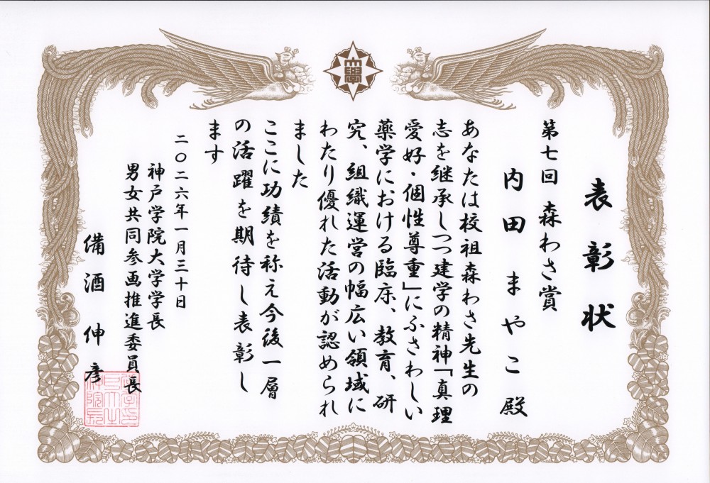2025年12月22日に開催された第7回神戸学院大学森わさ賞選考委員会において、内田まやこ教授の受賞が満場一致で決定されました。